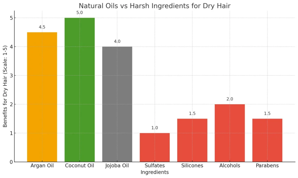 On the other hand, choosing a shampoo that’s free of these ingredients allows your hair to retain the moisture it needs, leaving it healthier, softer, and more manageable. You can see the benefits of natural oil and these ingredients in the above graph on 1-5 scale.